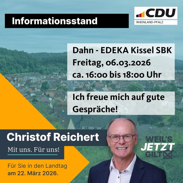 mehrAm Wochenende erreichen Sie mich wieder an den Infoständen der CDU zur Landtagswahl.Am Freitag von 16:00 bis 18:00 Uhr in DahnAm Samstag von 8:00 bis 9:45 Uhr in Lemberg undvon 10:00 bis 12:00 Uhr in Pirmasens.Kommen Sie vorbei, informieren Sie sich sich aus erster Hand.Ich freue mich auf Ihren Besuch.#dahn #lemberg #pirmasens #südwestpfalz #cdurlp #landtagswahlrlp2026