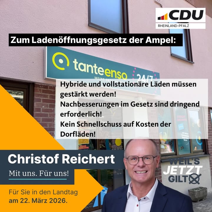 mehrHier die gemeinsame Presseerklärung mit meinem Kollegen Christoph Gensch: Ladenöffnungsgesetz der Ampelregierung nicht ausgereiftNachbesserungen gerade für hybride und vollautomatische Dorfläden dringend notwendig! Im Hauruckverfahren will die Ampelregierung in Rheinland-Pfalz noch vor der Landtagswahl im März das Ladenöffnungsgesetz ändern. Mit dem Gesetz werden sensible Fragen wie Sonntagsöffnung, Feiertagsschutz und auch Arbeitnehmerschutz geregelt. Deshalb ist es wichtig, dass das Gesetz in einer Expertenanhörung aus den verschiedensten Blickwinkeln beleuchtet wird. Wenn sich nun gerade die FDP und deren Fraktionsvorsitzender Steven Wink darüber beschwert, dass die CDU hier eine grundlegende intensive Beratung durch eine Anhörung beantragt, ist dies Ausdruck eines mangelhaften Demokratieverständnisses. Fünf Jahre hatte die Ampel Zeit, ein Gesetz einzubringen und die sehr späte Vorlage ist ein Versäumnis, das die Ampelfraktionen zu vertreten haben. Dazu erklären die CDU-Landtagsabgeordneten Christof Reichert (Hauenstein) und Christoph Gensch (Zweibrücken): "Wir stehen als CDU klar an der Seite des Einzelhandels und der Menschen im ländlichen Raum, für die eine funktionierende Nahversorgung wichtig ist. Gerade die hybriden Läden in unserer Region, wie Tante Enso in Eppenbrunn und Heltersberg oder Wasgau 24/7 in Pirmasens, steigern die Lebensqualität der Menschen enorm. Diese innovativen Konzepte dürfen nicht durch ein schlecht gemachtes Gesetz gefährdet werden!" Gewiss ist eine rechtssichere Grundlage für den verlässlichen Betrieb dieser hybriden oder vollautomatisierten Läden erforderlich, aber die momentane rechtliche Grauzone ist aktuell besser als der Gesetzentwurf der Landesregierung. So sehen Reichert und Gensch großen Nachbesserungsbedarf insbesondere hinsichtlich der Beschränkungen der Verkaufsfläche aber auch bei den Einschränkungen der Öffnungszeiten an Sonntagen. Das Ziel ist klar: den ländlichen Raum stärken, moderne Konzepte ermöglichen und Planungssicherheit für Handel und Kommunen schaffen. Das gelingt nur durch einen guten Dialog mit den Betreibern und Kommunen!