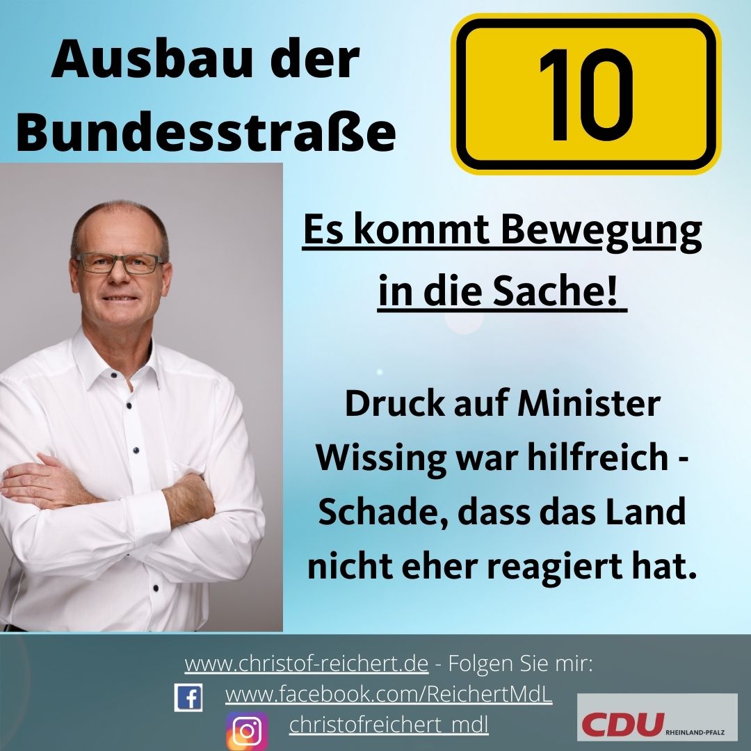 Der CDU-Abgeordnete hatte die Landesregierung zum Sachstand beim vierspurigen Ausbau der B10 im Bereich Hinterweidenthal-Hauenstein, sowie beim Bau des LKW-Rastplatzes bei Wilgartswiesen befragt. Das Projekt LKW-Parkplatze stockte laut Landesregierung wegen fehlender Möglichkeit, einen Anhörungstermin vor Ort zu machen. Es wurde auf die Corona-Bekämpfungsverordnung verwiesen und auf die Regelungen, dass sich so viele Menschen nicht gleichzeitig treffen dürfen. Reichert hatte damals deutlich Kritik geäußert und Minister Wissing Verzögerung vorgeworfen.