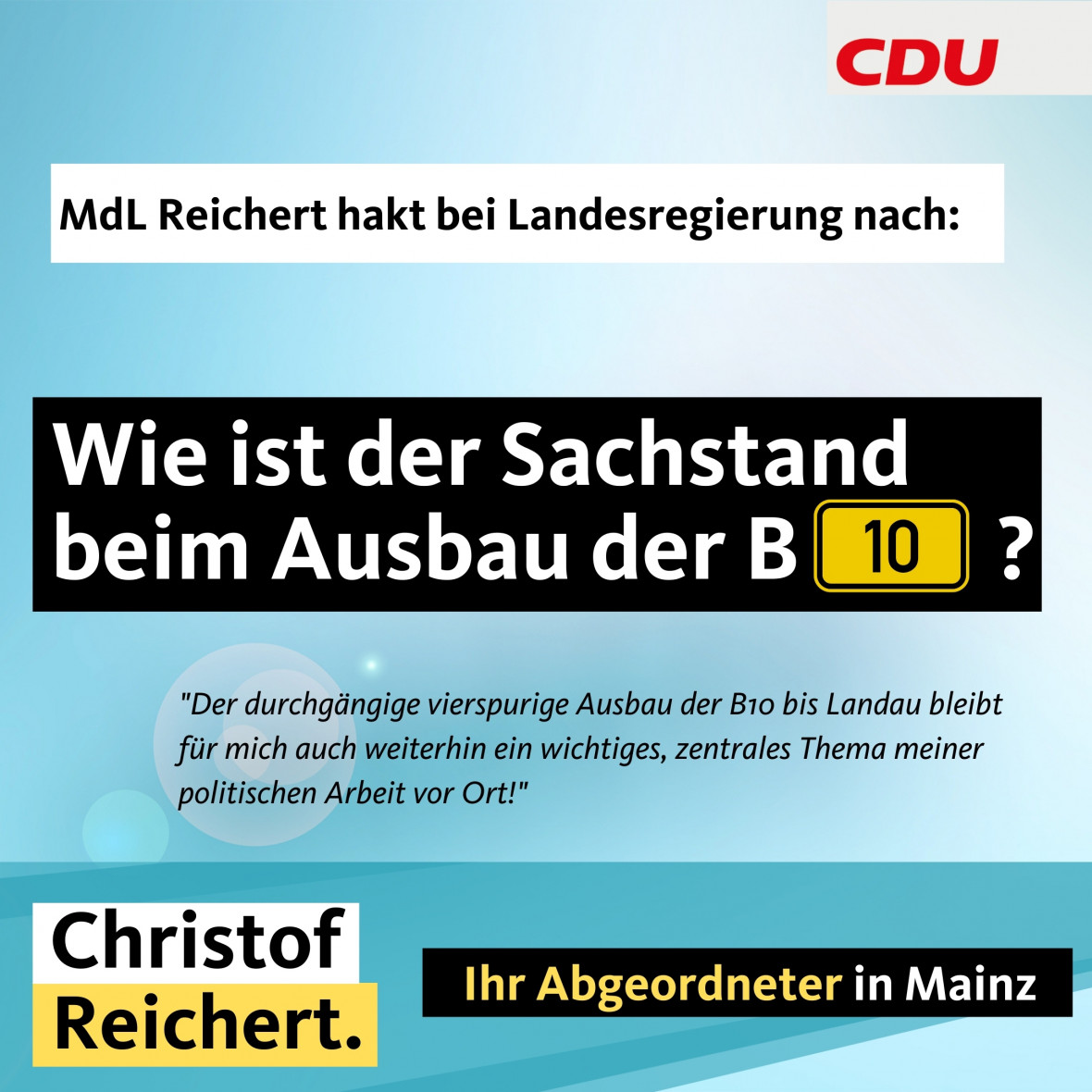 Der CDU-Landtagsabgeordnete Christof Reichert aus Hauenstein will in mehreren kleinen Anfragen an die Landesregierung den Sachstand der einzelnen Bauabschnitte beim vierspurigen Ausbau der B10 von Hinterweidenthal bis nach Landau wissen. Reichert will von der Landesregierung auch wissen, wie das weitere Vorgehen bei den einzelnen Bauabschnitten ist, ebenso den Zeitplan und wann mit Baubeginn bei den einzelnen Abschnitten zu rechnen ist. „Der durchgängige vierspurige Ausbau der B10 bis Landau bleibt für mich auch weiterhin ein wichtiges, zentrales Thema meiner politischen Arbeit vor Ort. Dabei gilt auch immer, die Wichtigkeit dieses Projektes bei der Landesregierung zu erwähnen und auf Dringlichkeit zu drängen“, so Reichert.