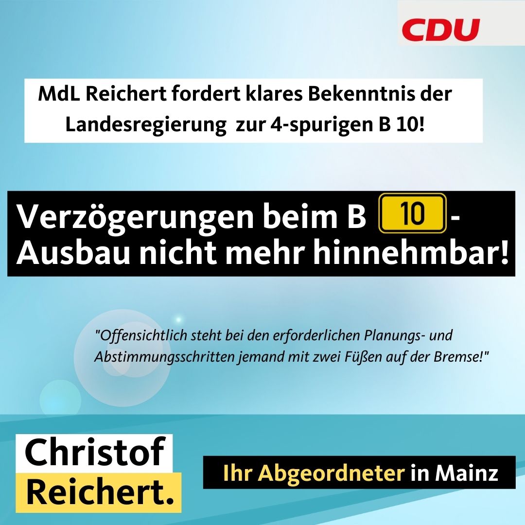 Der CDU-Landtagsabgeordnete Christof Reichert übt an der Landesregierung deutliche Kritik in Sachen vierspuriger Ausbau der B10. „Offensichtlich steht bei den erforderlichen Planungs- und Abstimmungsschritten jemand mit zwei Füßen auf der Bremse“, so Reichert wörtlich. Reichert fasst so die Antworten auf seine Kleinen Anfragen zu den einzelnen Bauabschnitten der B10 zusammen. „Die Antworten auf die Kleinen Anfragen zum Sachstand zeigen, dass sich in den vergangenen Monaten wenig bewegt hat. Einzelne Abschnitte stecken noch nahezu in den Kinderschuhen fest, bei anderen Abschnitten ist trotz bisheriger anderslautender Auskünfte kein Fortschritt erkennbar. Das ist nicht weiter hinnehmbar“, so Reichert. Der Abgeordnete fordert daher, dass die zuständige Ministerin Daniela Schmitt (FDP) die B10 endlich zur Chefsache erklärt.