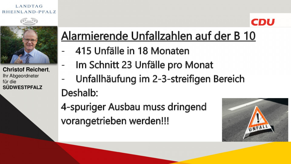 Die Auswertung zeigt, dass noch immer der dreispurige Bereich der B10 am häufigsten betroffen ist. „Die Zahlen sprechen für einen zügigen vierspurigen Ausbau. Ich erwarte daher, dass man in Mainz endlich mal einen Zahn zulegt. Nachdem das zuständige Ministerium die Notwendigkeit des Ausbaus erkannt hat und auch die Unfallzahlen für einen durchgängig vierspurigen Ausbau sprechen, muss Minister Wissing den weiteren Ausbau der B10 zur Chefsache machen. Das ist der Minister den vielen täglichen Fahrern und deren Familien auf der B10 einfach schuldig“, so Reichert abschließend.