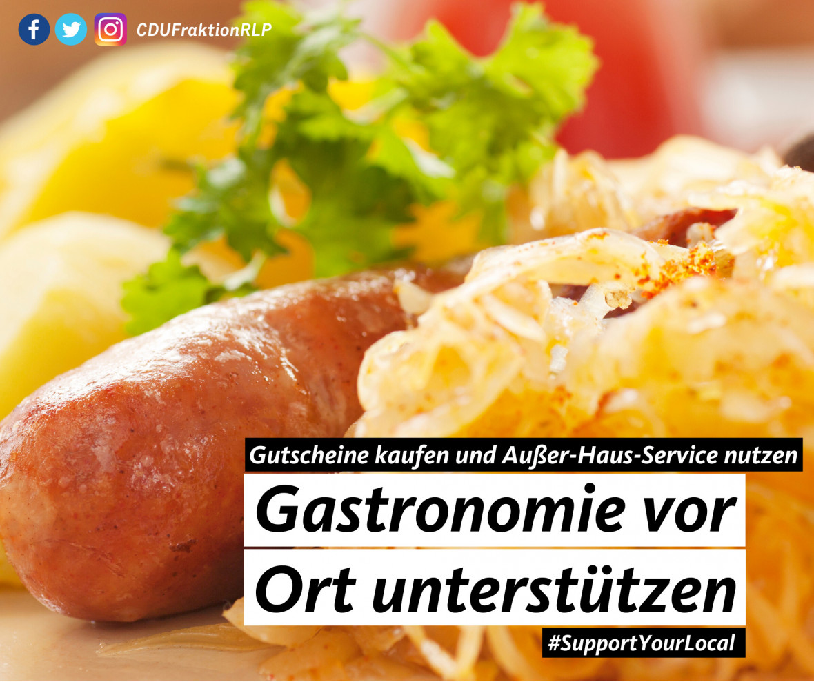 „Unterstützen Sie unsere heimische Gastronomie und Hotellerie durch den Kauf von Gutscheinen und durch die Nutzung von Außer-Haus-Service“, so heute der heimische CDU-Landtagsabgeordnete Christof Reichert in einem Appell an die Bürgerinnen und Bürger in der Region Südwestpfalz. Nicht zuletzt an den bevorstehenden Feiertagen würden die ohnehin schon dramatischen finanziellen Einbußen durch den Wegfall des Ostergeschäfts einmal mehr besonders spürbar.