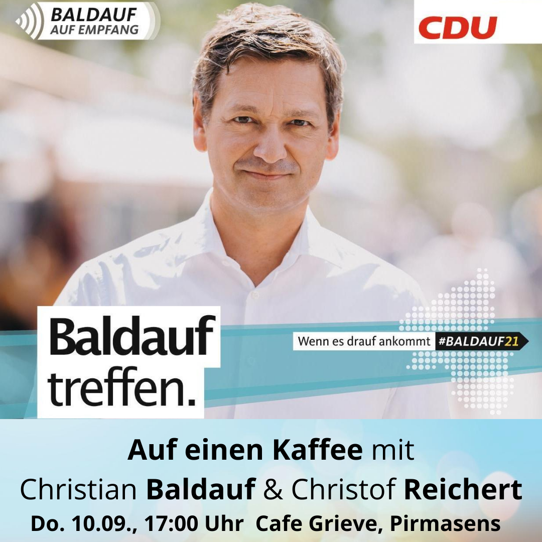 Auf seiner Tour quer durch Rheinland-Pfalz besucht der Spitzenkandidat der CDU Rheinland-Pfalz für die Landtagswahlen und Vorsitzender der CDU-Landtagsfraktion Christian Baldauf auch den Wahlkreis Pirmasens-Land. Damit Sie sich einen persönlichen Eindruck von dem Politiker und Menschen Christian Baldauf machen können, lädt der Wahlkreisabgeordnete Christof Reichert interessierte Bürgerinnen und Bürger herzlich für Donnerstag, 10.September 2020, 17:00 Uhr zur Veranstaltung „Auf einen Kaffee mit Christian Baldauf und Christof Reichert“ im Café Grieve“, Pirmasens, Robert-Schelp-Platz 1, ein.